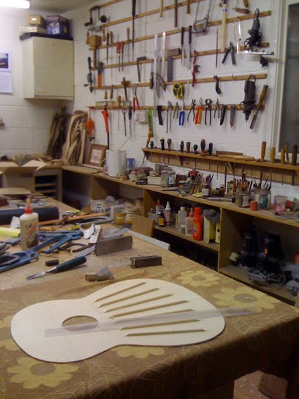 Having looked for a very long time we have finally found a planer/thicknesser for machining timber. It came from a guitar maker called Martin Cole who had the most incredible workshop. The guitar pattern on the bench is the last he plans on making due to years of fine wood dust affecting his health and more importantly his singing voice.