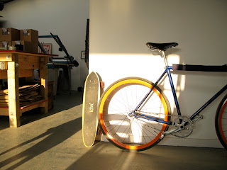 Bike by Adam our resident fixie builder, board by MPI a genuine 1970s Fibreflex look alike, one of many rediscovered in a container in Santa Monica last summer. What a find!