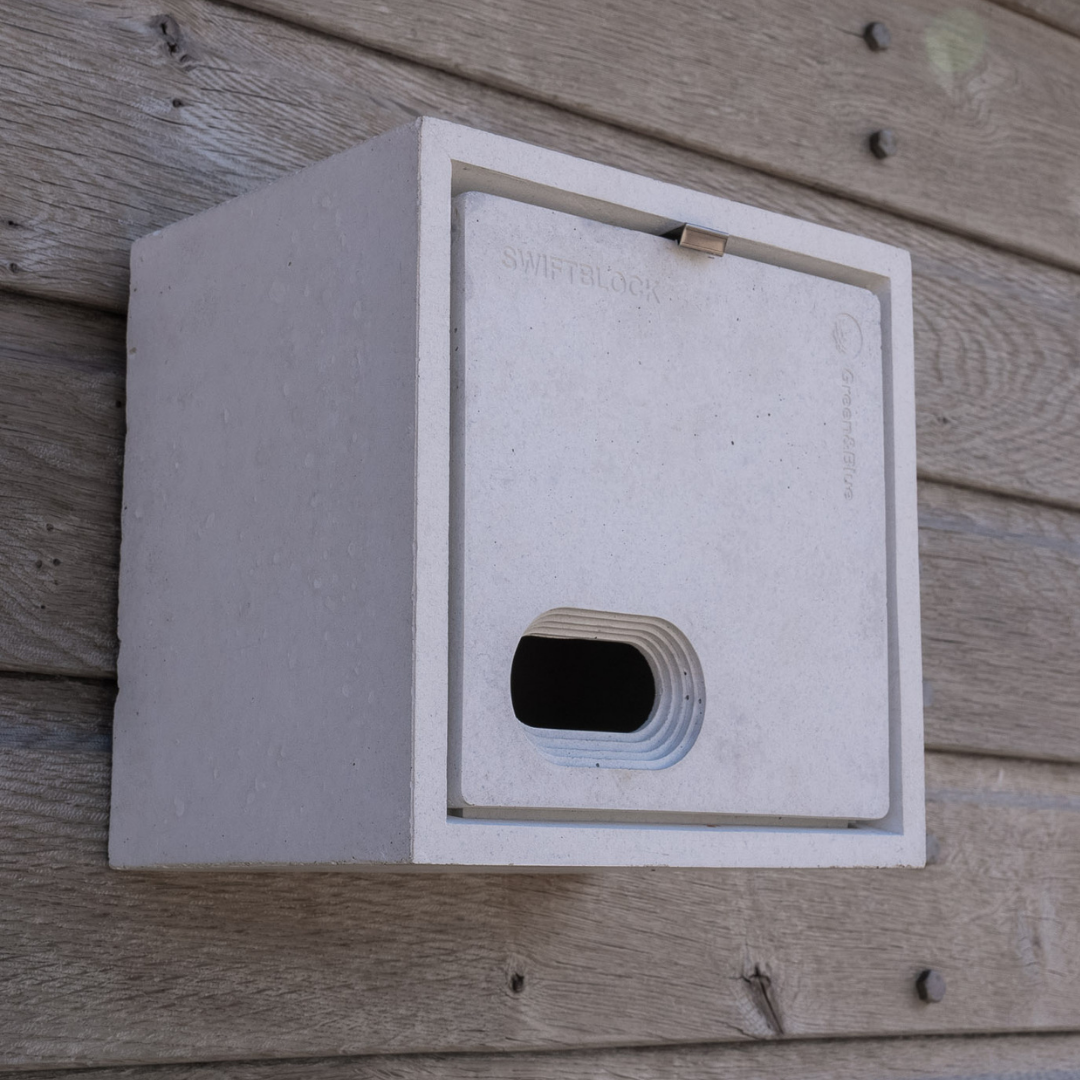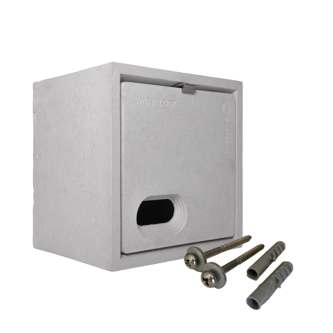 The Green&Blue SwiftBlock swift box features an internal nesting bowl, a small entrance hole to deter larger birds and predators, and is UK standard block size. It can be purchased with a fixing kit to enable surface mounting.